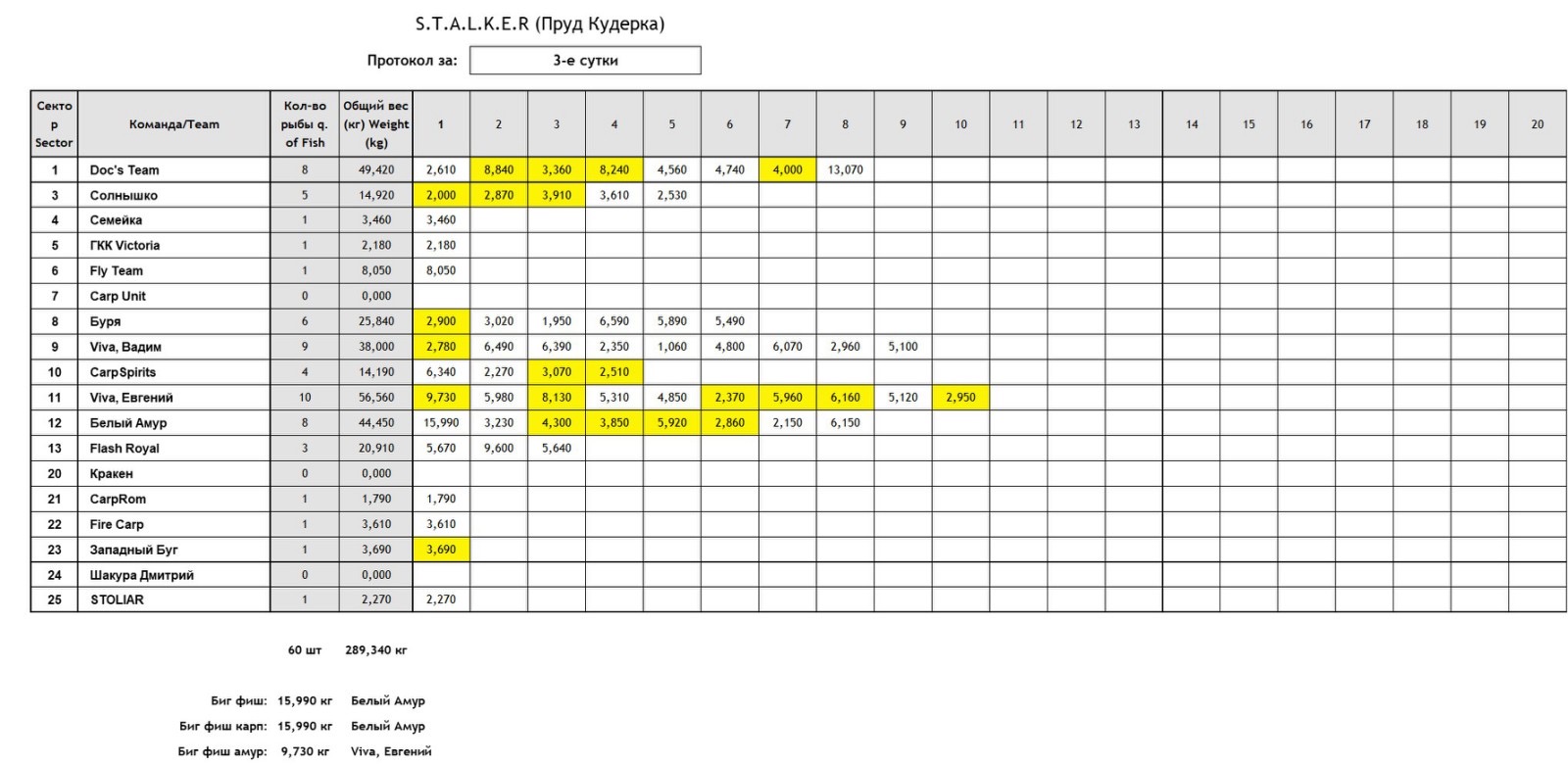 В зачет идут только зеркальные, чешуйчатые, голые карпы, белые и черные амуры с весом не менее 1 кг. Пойманная рыба до взвешивания должна храниться в карповых мешках (не более одного экземпляра в каждом мешке). Мешки должны находиться максимально глубоко под водой, внутри мешков не должно быть посторонних предметов.